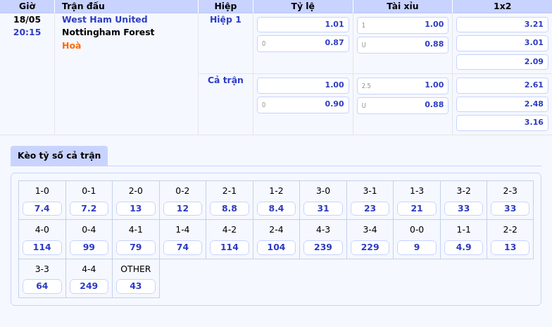 Với mức tài xỉu 2.5, lựa chọn Xỉu là kịch bản đáng tin cậy. Cả hai đội đều không có hiệu suất ghi bàn ấn tượng trong thời gian gần đây khi West Ham ghi được 12 bàn và thủng lưới 12 bàn trong 10 trận, còn Nottingham Forest có 11 bàn thắng nhưng để lọt lưới tới 13 lần. Thế trận được dự đoán sẽ giằng co và ít bàn thắng khi cả hai đều có xu hướng chơi thận trọng.